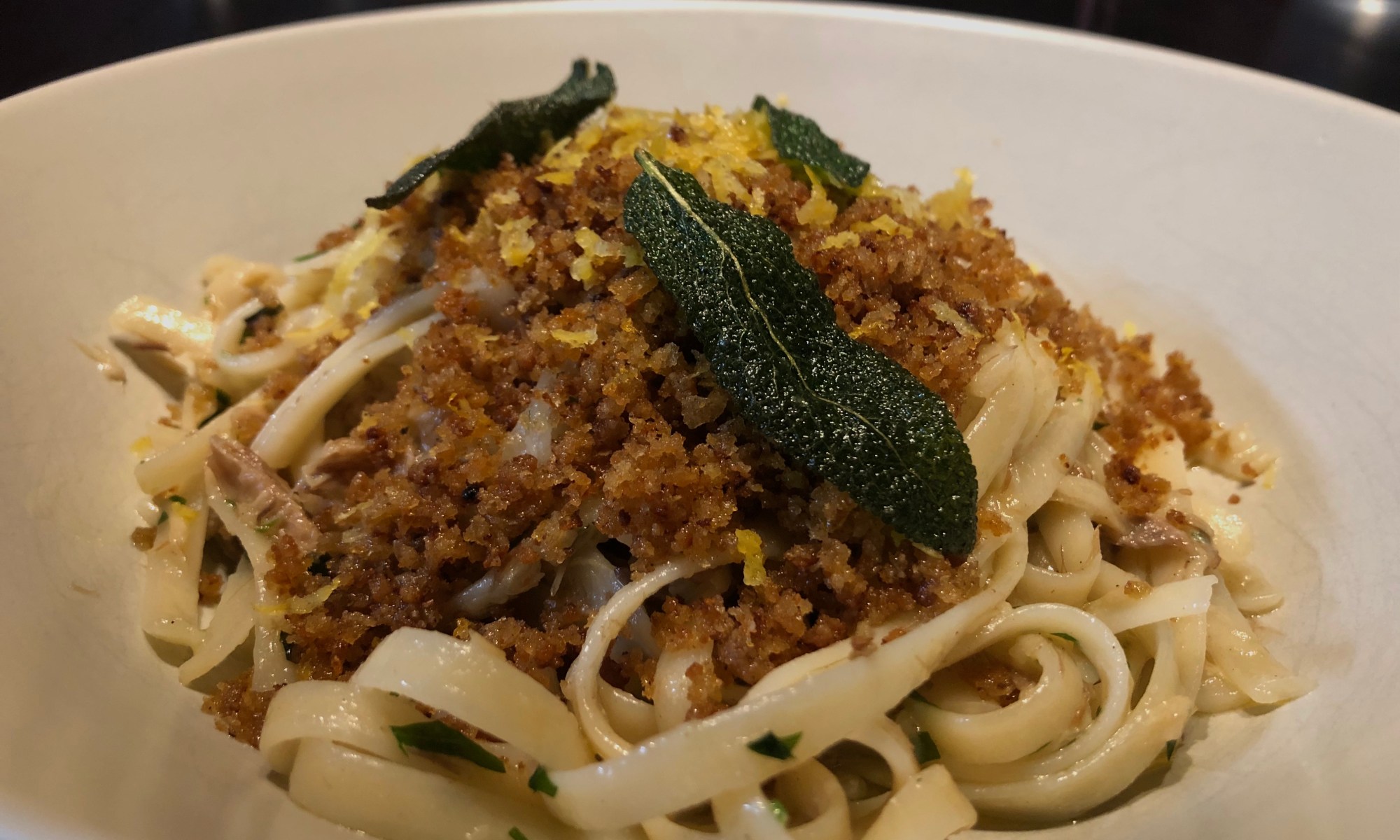 Divine the pasta and sauce among shallow bowls and sprinkle liberally with the toasted breadcrumbs. Add some finely grated lemon zest, drizzle with extra virgin olive oil, add the salt flakes and sage leaves, and serve.