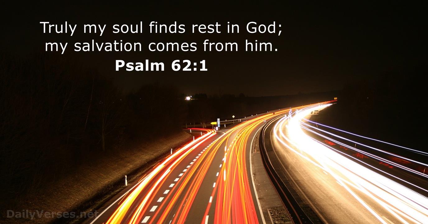 “Truly my soul finds rest in God; my salvation comes from him” (v. 1). We sometimes think of a “soul” as the part of us that exists forever, or the bit that gets “saved” when we convert to Christ. But David’s understanding of anthropology drew on Old Testament theology and wisdom, and when he referred to his “soul” he meant his whole person: body, mind and spirit.