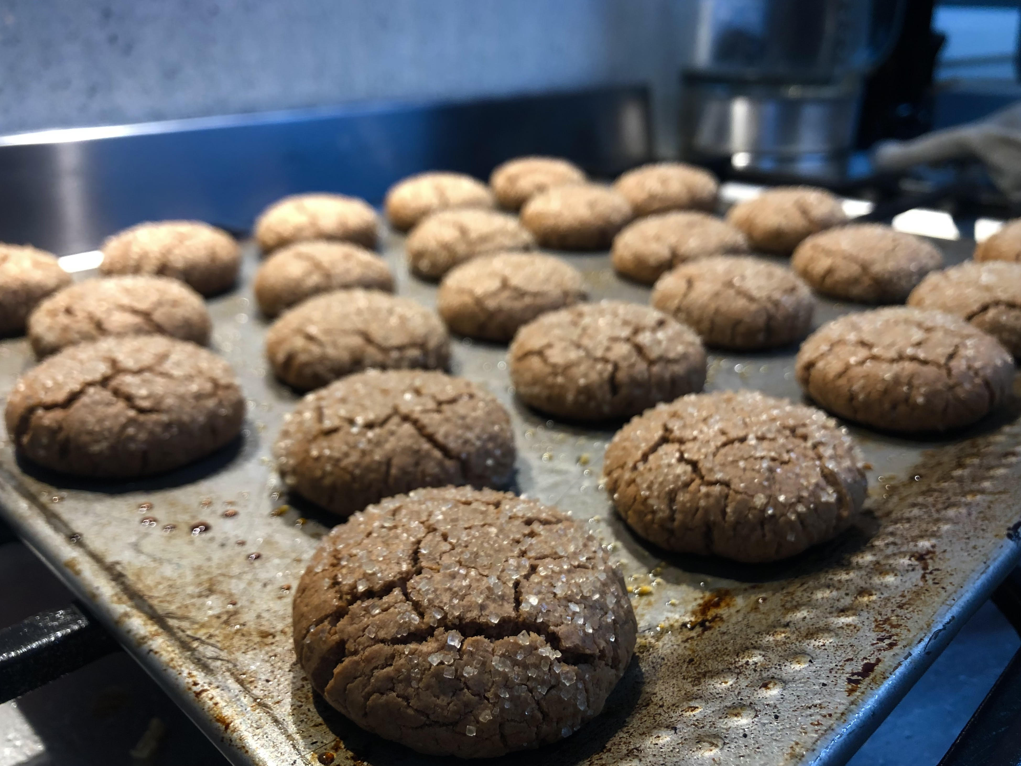Roll the dough into balls the size of walnuts and press almost flat in the palm of your hand. If necessary, turn and gently pinch the sides to make perfect rounds and eliminate cracks. Pour the raw sugar into a small bowl, then dip one face of each biscuit in the sugar to coat. Place the biscuits sugar side up on the greased tray, allowing space for spreading. Bake for 10-12 minutes. Makes about 24.