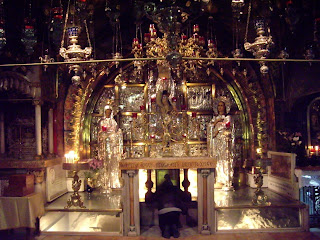 We explored the beautiful (some would say austere) Lutheran Church of the Redeemer where I picked up an excellent booklet titled “The Holy Places Today” by M. Basilea Schlink, and then the cavernous Church of the Holy Sepulcre, which I visited on Sunday, although this time I discovered a garish Golgotha on the upper floor (pictured), which I had previously overlooked, possibly because of the crush of tour groups.