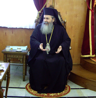 Our first meeting was a short devotion by Rev Gregor Henderson, who read Psalm 122 and reflected on that famous Jewish psalm’s references to peace and security in Jerusalem. Then we walked from our hotel up the street and around the corner to the Greek Patriarchate, where we had an audience with His Beatitude Patriarch Theophilos III, Greek Orthodox Patriarch of Jerusalem (pictured, in discussion with us this morning).